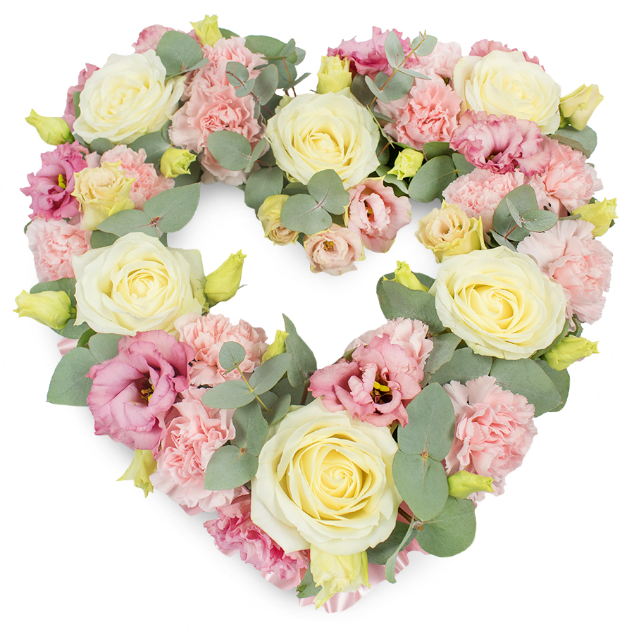 Pay homage to your loved ones with our Graceful Tribute Heart Arrangement. This exquisite bouquet features a delicate mix of white roses, pink carnations, pink lisianthus, and aromatic eucalyptus leaves, elegantly arranged to symbolize enduring love and remembrance.