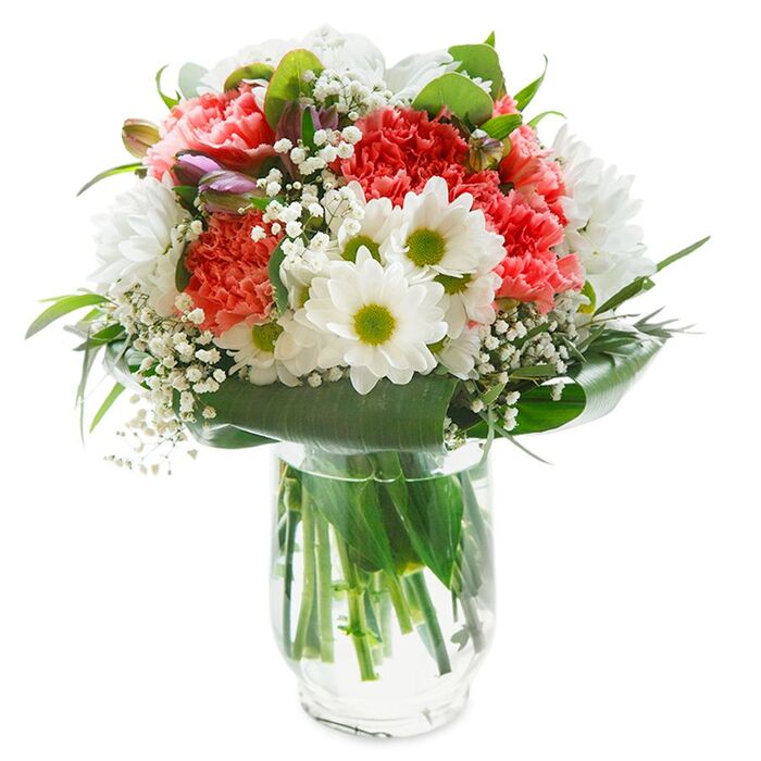 Enhance any setting with our graceful floral display. This unique bouquet blends snow-white chrysanthemums, airy gypsophila, and light pink carnations, thoughtfully arranged with rich aspidistra leaves for a touch of greenery.